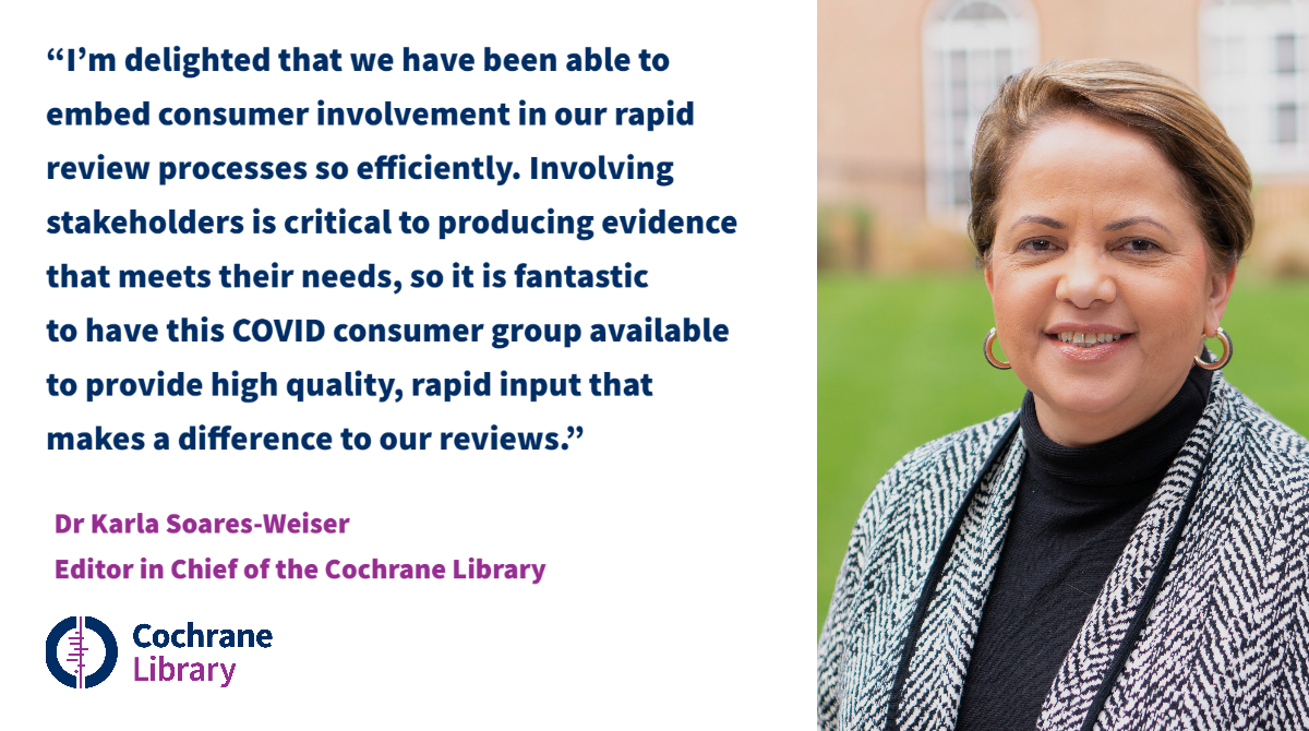 Karla Soares-Weiser, Editor in Chief of the Cochrane Library, was enthusiastic about the process: “I’m delighted that we have been able to embed consumer involvement in our rapid review processes so efficiently. Involving stakeholders is critical to producing evidence that meets their needs, so it is fantastic to have this COVID consumer group available to provide high quality, rapid input that makes a difference to our reviews.”